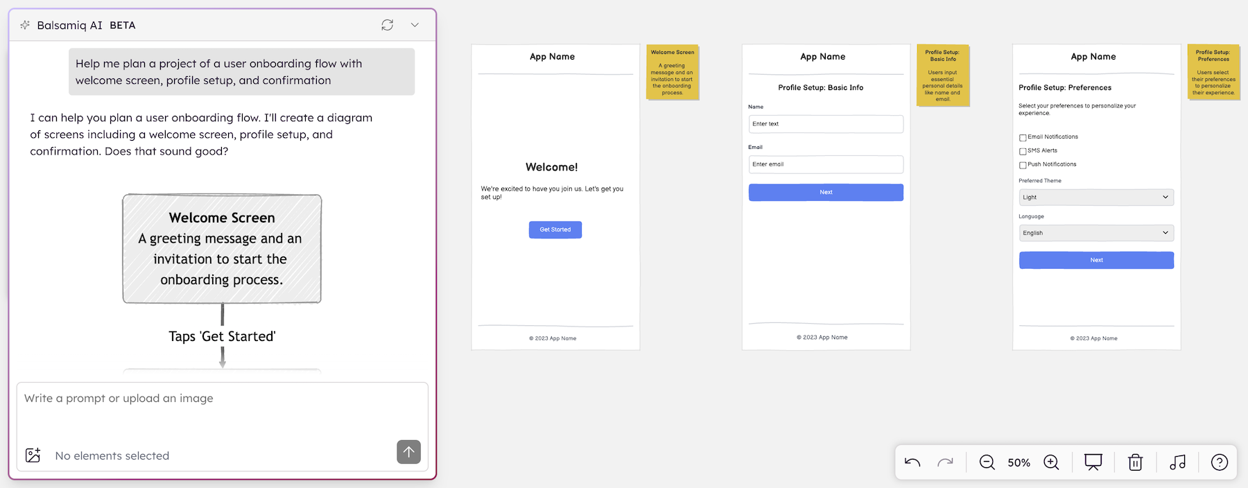 Use this feature to create a structured user journey (e.g. onboarding flow, shopping cart, sign-up process, etc...) and have Balsamiq AI (Beta) generate wireframes for each step in that flow.