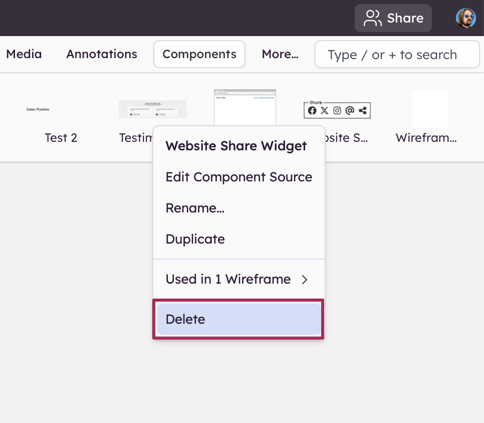 Note: Deleting a Component deletes it permanently. However, you can use the undo to restore it (CTRL/CMD+Z)