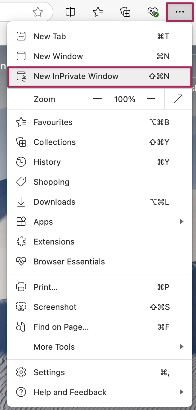 To open an InPrivate Window in Microsoft Edge, open the Edge Menu in the upper-right-hand corner of the browser window and select New InPrivate window. You can also use the shortcut
