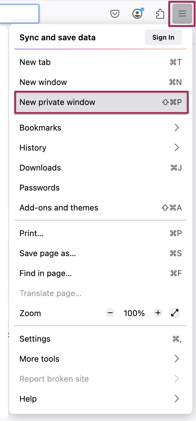 To open a Private Browser Window in Firefox, click on the Firefox Menu in the upper-right-hand corner of the browser and select New Private Window. You can also use the shortcut