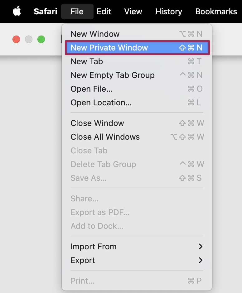To open a Private Browser window in Safari, go up to the File Menu and select New Private Window. You can also use the Keyboard shortcut